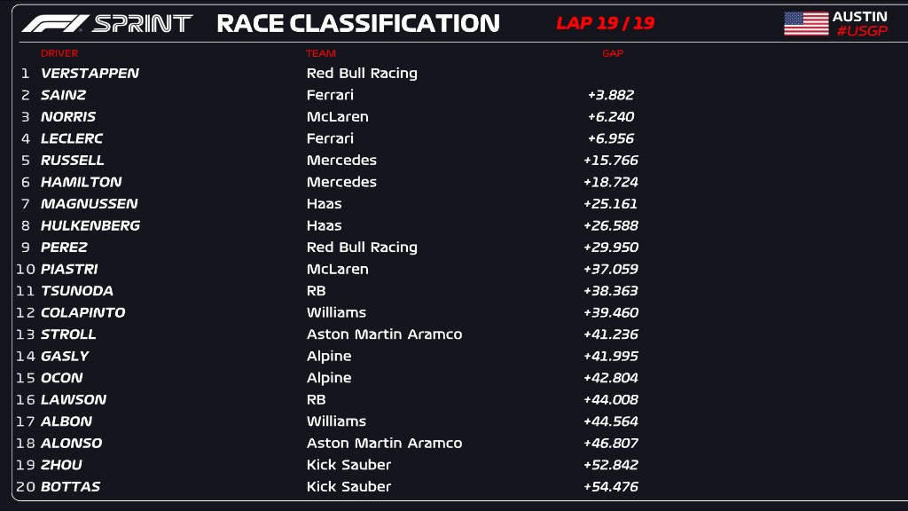 Επιστροφή στις νίκες μετά από σχεδόν τέσσερις μήνες για τον Φερστάπεν! Ο Παγκόσμιος Πρωταθλητής και πιλότος της Red Bull κυριάρχησε στο Sprint Race του Grand Prix που διεξάγεται στο Όστιν των ΗΠΑ, δεν έχασε καθόλου την πρωτοπορία και τελικά τερμάτισε στην πρώτη θέση, παίρνοντας τους έξτρα πόντους!