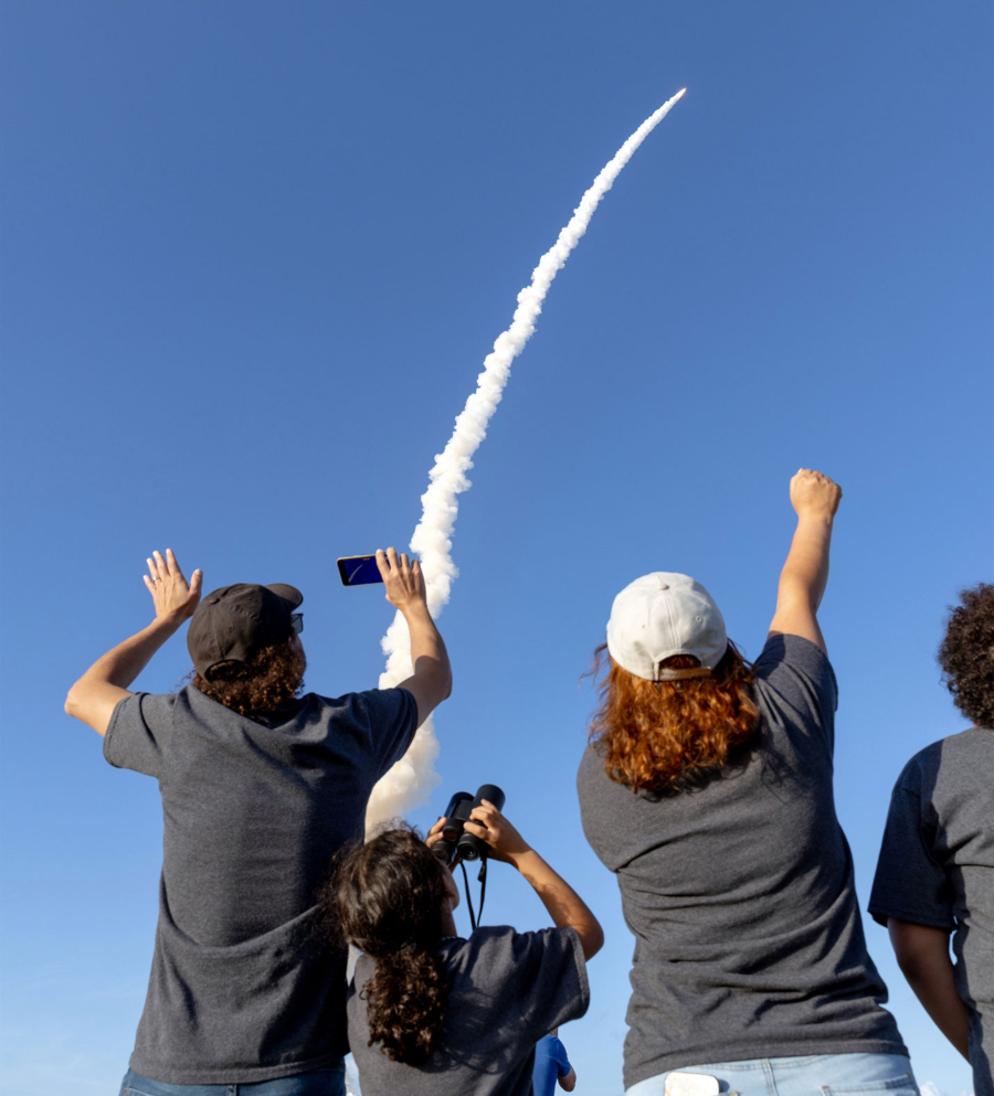 Πλήθος παρακολουθεί ενθουσιασμένο την εκτόξευση της επανδρωμένης αποστολής της NASA «Αρτεμις II», την Τετάρτη, από τη Φλόριντα με προορισμό τη Σελήνη. [Cassandra Klos/The New York Times]
