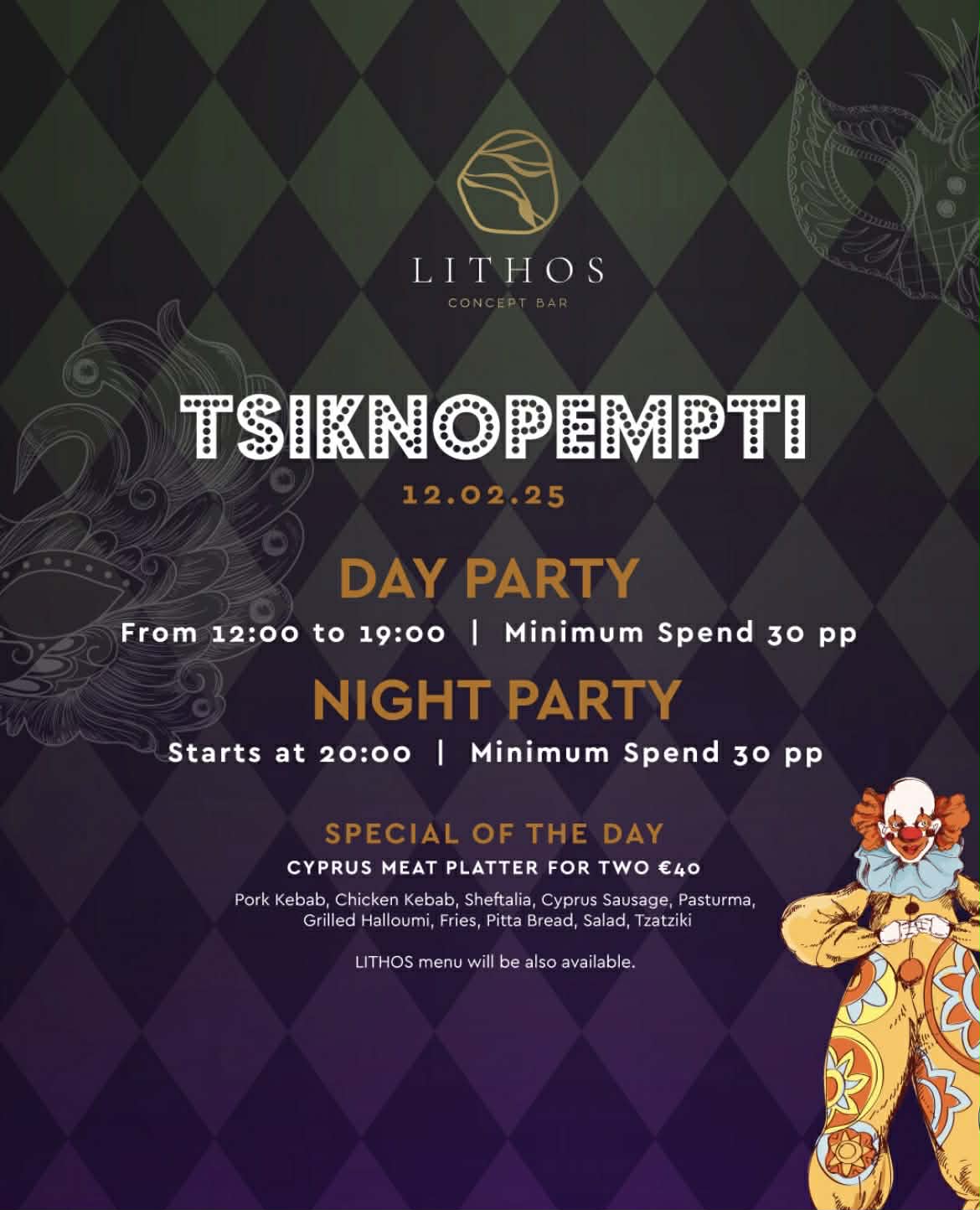 Με δύο πάρτι, μεσημέρι και βράδυ. Εκτός από το κανονικό μενού θα προσφέρεται ειδικά για τη μέρα και ένα special of the day, ένα cyprus meat platter.