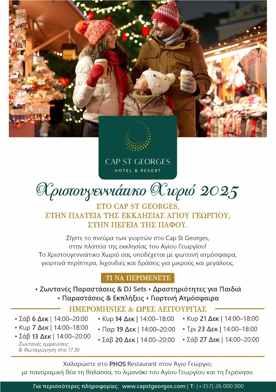 Αυτά τα Χριστούγεννα, η μαγεία ζωντανεύει σ’ έναν τόπο ξεχωριστό. Στο Cap St Georges, στην πλατεία της εκκλησίας Αγίου Γεωργίου, στην Πέγεια της Πάφου.