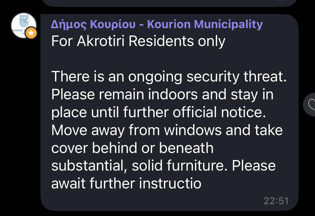 Σε σχέση με την ενεργοποίηση μέτρων ασφαλείας που σημειώθηκε νωρίτερα στις Βρετανικές Βάσεις, διευκρινίζεται ότι δεν έχει εντοπιστεί οποιαδήποτε απειλή.