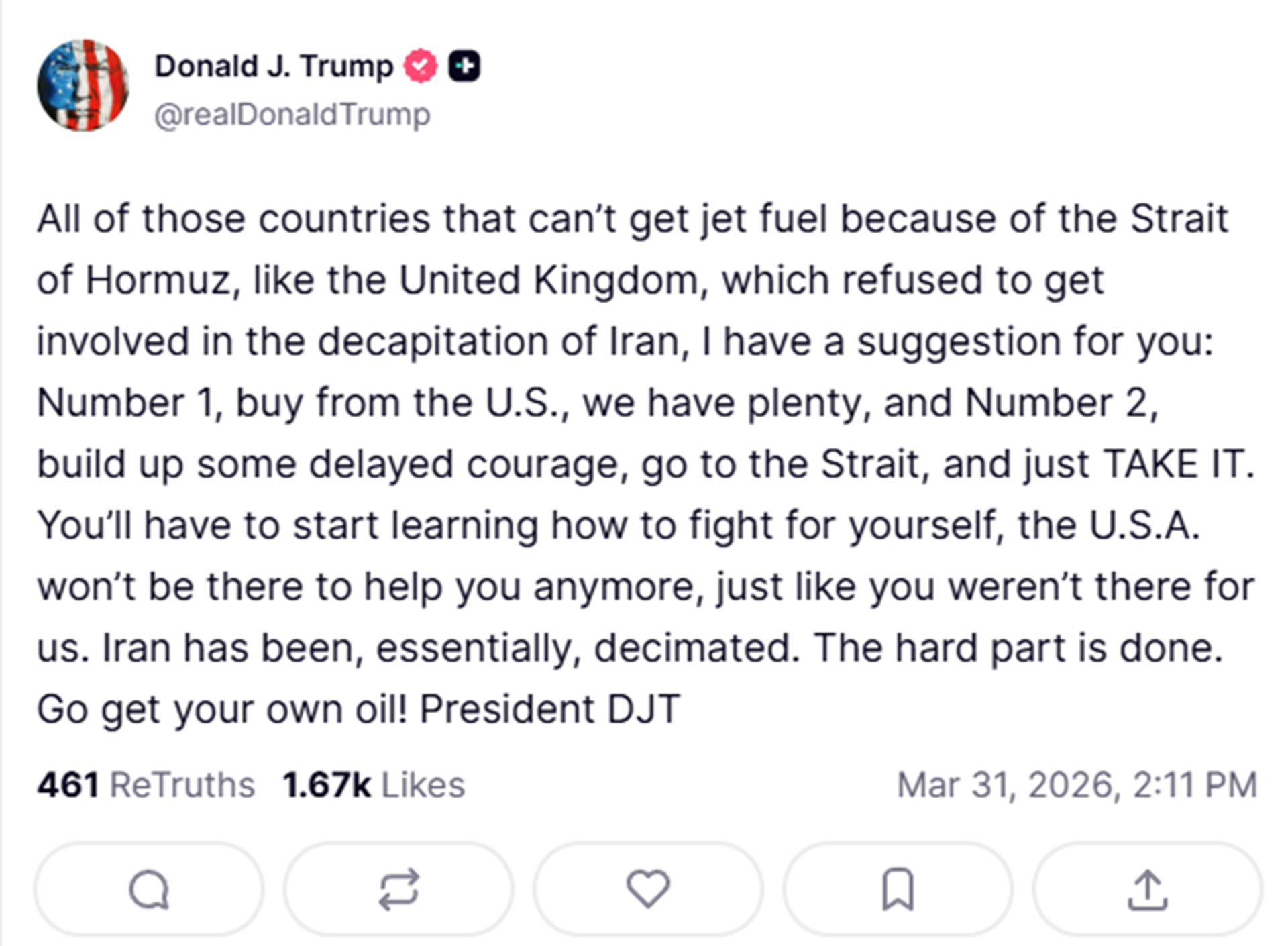 Οπως ανέφερε σε νέα του ανάρτηση, οι χώρες μπορούν να αγοράζουν πετρέλαιο από τις ΗΠΑ. Παράλληλα, κάλεσε τις χώρες να πάνε στα Στενά του Ορμούζ και να πάρουν το πετρέλαιο μόνες τους.