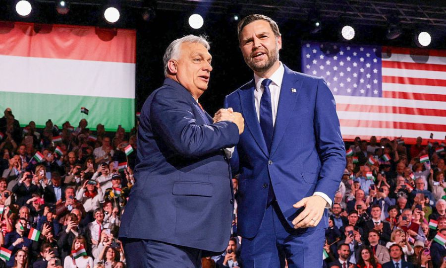 Η συνύπαρξη των Τζέι Ντι Βανς και Βίκτορ Ορμπαν στην εκδήλωση για την «Ημέρα της ουγγροαμερικανικής φιλίας» χαρακτηρίστηκε από ενσταντανέ οικειότητας – απτό δείγμα της στήριξης που προσέφερε ο Λευκός Οίκος στον πρωθυπουργό της Ουγγαρίας. [REUTERS / Jonathan Ernst / Pool]