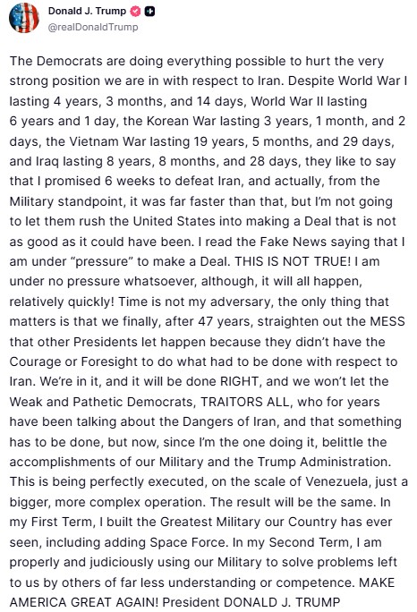 Ο πρόεδρος των ΗΠΑ, σε άλλη ανάρτηση, δήλωσε ότι δεν βρίσκεται «υπό πίεση» να συνάξει συμφωνία με το Ιράν, προσθέτοντας παράλληλα ότι κάτι τέτοιο μπορεί να συμβεί «σχετικά γρήγορα».