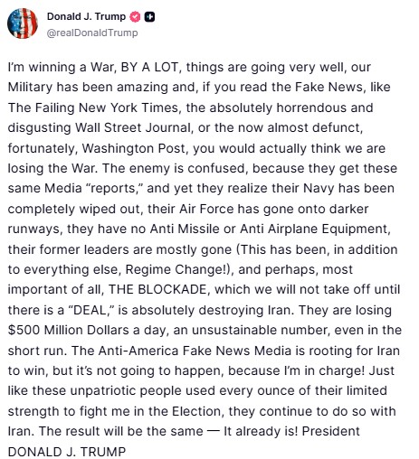 Σε μια ακόμη ανάρτηση στα μέσα κοινωνικής δικτύωσης, ο Τραμπ δήλωσε ότι οι ΗΠΑ κερδίζουν τον πόλεμο με το Ιράν «κατά κράτος», προσθέτοντας ότι «τα πράγματα πάνε πολύ καλά» και ότι ο αμερικανικός στρατός ήταν «καταπληκτικός».