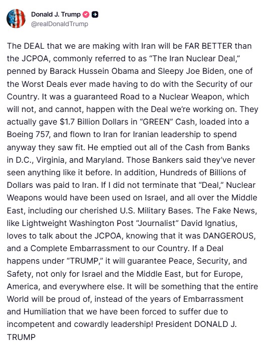 Με νέα ανάρτηση στο Truth Social, ο Ντόναλντ Τραπ δήλωσε ότι η συμφωνία που επεξεργάζονται οι ΗΠΑ είναι «πολύ καλύτερη» από εκείνη που είχε υπογράψει το Ιράν επί θητείας Ομπάμα.