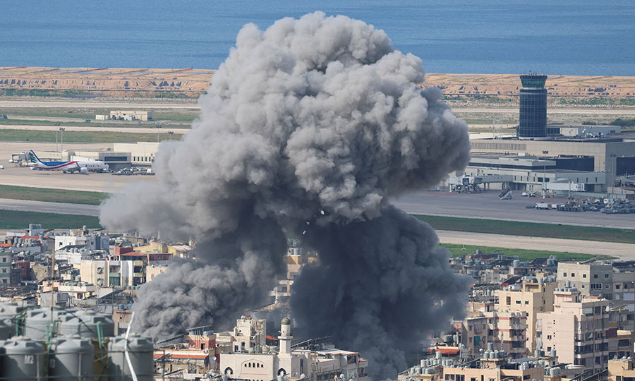 Καπνός στα νότια προάστια της Βηρυτού, πρωτεύουσας του Λιβάνου, με φόντο το Διεθνές Αεροδρόμιο, Ραφίκ Χαρίρι, έπειτα από ισραηλινή επιδρομή.