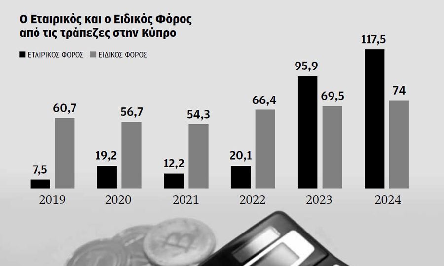 Αφήνοντας στην άκρη αν είναι σωστό ή λάθος να επιβληθεί μία 3η φορολογία στις κυπριακές τράπεζες, αφού είναι κάτι που θα κρίνει η Βουλή των Αντιπροσώπων, ασχέτως αν πάει για το 2025 ή για το 2026, τα δεδομένα είναι τα παρακάτω. Σύμφωνα με στοιχεία που συνέλεξε η «Κ» από τις τράπεζες, από το 2019 έως 2024, δόθηκαν το 2019 μέσω του εταιρικού φόρου 7,5 εκατ. ευρώ και μέσω του ειδικού 60,7 εκατ. ευρώ. Για το 2020 δόθηκαν 19,2 εκατ. ευρώ μέσω του εταιρικού και 56,7 εκατ. μέσω του ειδικού. Για το 2021 τα χρήματα που δόθηκαν από τις τράπεζες ήταν στα 12,2 μέσω του εταιρικού φόρου και στα 54,3 εκατ. ευρώ μέσω του ειδικού. Το 2022, τα χρήματα που καταβλήθηκαν από τις τράπεζες μέσω του εταιρικού φόρου ήταν 20,1 εκατ. ευρώ και μέσω του ειδικού 66,4 εκατ. ευρώ. Το 2023 όπως «εκτοξεύθηκαν» τα επιτόκια και τα κέρδη των τραπεζών, εκτοξεύθηκαν και οι δύο φόροι που δίνουν. Χαρακτηριστικά, το 2023 κατέβαλαν 95,9 εκατ. ευρώ για τον εταιρικό φόρο και 69,5 εκατ. ευρώ στον ειδικό. Το 2024, ο εταιρικός φόρος έφτασε τα 117,5 εκατ. ευρώ και ο ειδικός τα 74 εκατ. ευρώ.