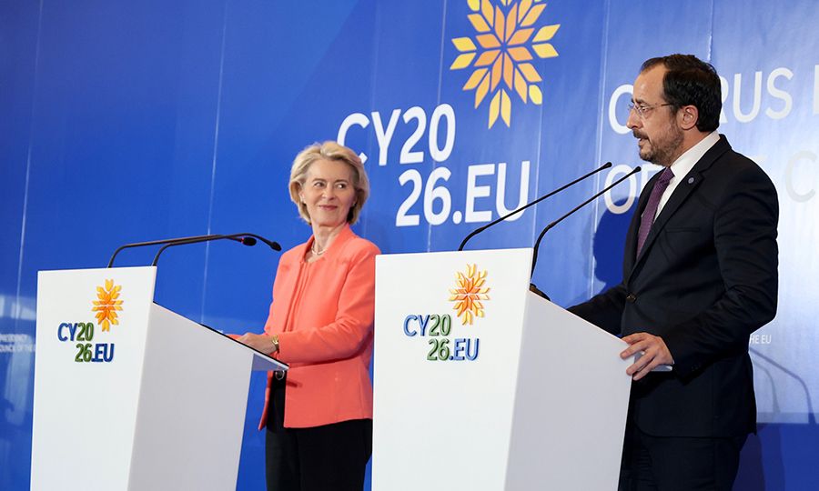 Μαζί πλοηγούμε σε ταραγμένα πολιτικά ύδατα, είπε η Πρόεδρος της Ευρωπαϊκής Επιτροπής Ούρσουλα φον ντερ Λάιεν, σε συνέντευξη Τύπου με τον Πρόεδρο της Δημοκρατίας Νίκο Χριστοδουλίδη, προσθέτοντας ότι η Κύπρος, που βρίσκεται στο σταυροδρόμι ηπείρων και πολιτισμών έχει μοναδική εμπειρογνωμοσύνη που θα μετρήσει πολύ για την προώθηση των θεμάτων της ΕΕ το 2026.