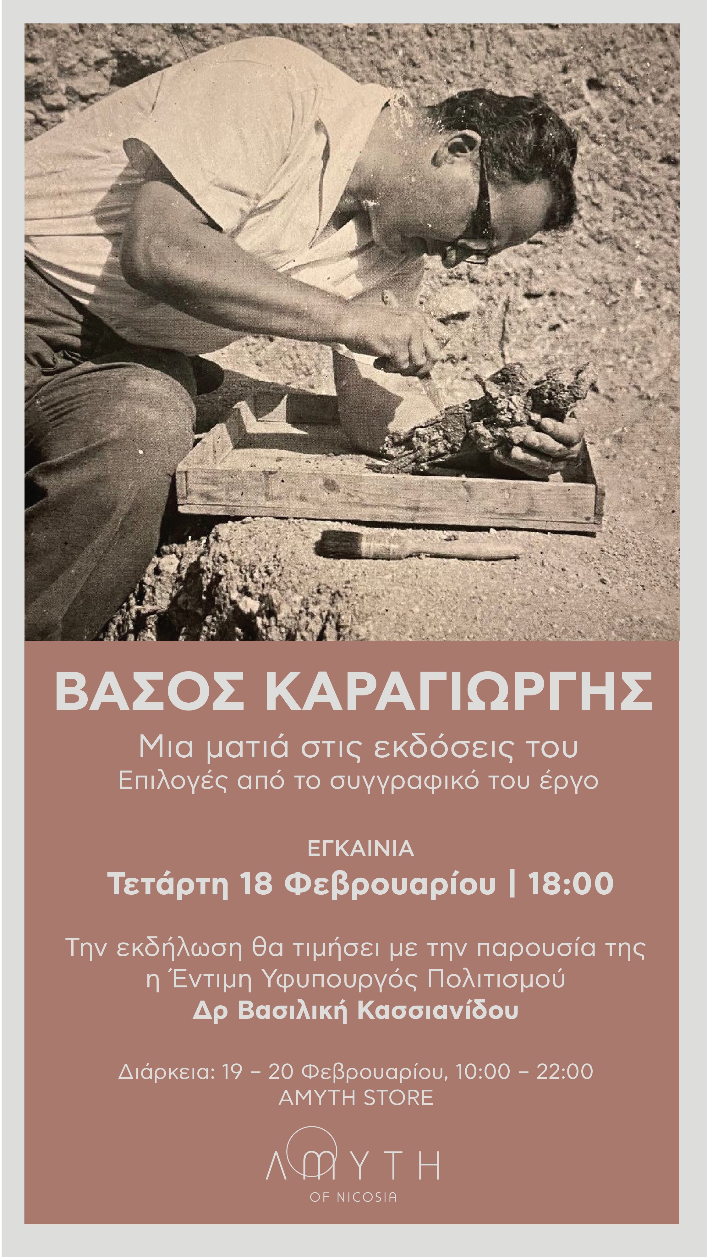Με αφορμή τα τέσσερα χρόνια από το θάνατο του καταξιωμένου αρχαιολόγου Βάσου Καραγιώργη, ο Όμιλος Thanos Hotels, η διεύθυνση του ξενοδοχείου Amyth και ο επιμελητής του Amyth Store Σάββας Χριστοδουλίδης σας προσκαλούν σε μια γνωριμία με το συγγραφικό του έργο. Οι ογδόντα επιλεγμένες εκδόσεις που παρουσιάζονται στο Amyth Store προέρχονται από το προσωπικό του αρχείο και διατίθενται από την οικογένεια του αποσκοπώντας στην ευρύτερη γνωριμία του κοινού με το έργο του. Οι επιλεγμένες εκδόσεις καλύπτουν μια μεγάλη περίοδο της έρευνας του εκκινώντας με το βιβλίο Chypre (1968) στις εκδόσεις Nagel της Γενεύης μέχρι και το τελευταίο του βιβλίο Με τον Όμηρο στις μέρες του κορωνοϊού (2021) από τις εκδόσεις Καπόν της Αθήνας.